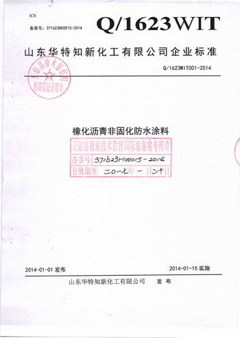??? 2014年1月15日,山東華特知新化工有限公司《橡化瀝青非固化防水涂料企業(yè)標準》在生產(chǎn)基地所在地無棣縣技術監(jiān)督局順利通過備案。
